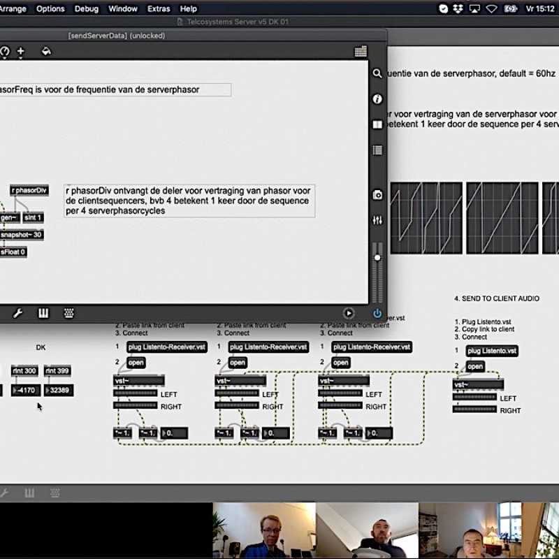 Based on the research and the experiments conducted, we have developed several prototypes. The first was based on the real-time peer-to-peer transfer of sync and data as a continuous signal. This turned out to be too prone to failure, synchronization proved difficult, and data feedback occurred. The second prototype was based on a server and three clients. However, this solution still requires a relatively large amount of bandwidth (4 channels in and 4 channels out for the clients, 12 channels in and 4 channels out for the server). And importantly, the bandwidth must be constant and stable, because we send and receive signals in real-time (almost real-time, with a latency of 0.3 seconds), buffering is not possible (something that is possible when streaming of pre-recorded audio or video, such as Netflix etc). Hiccups in the signal or accelerations and delays (which often happens with services such as Skype, Zoom, Teams) cannot occur, because that disrupts the sync with the local AV sources.