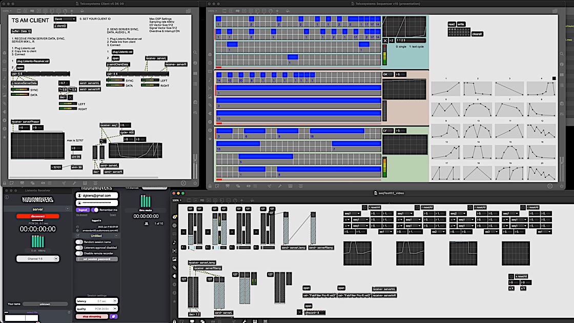 To be able to work in sync with each other, and to avoid data feedback, we experimented with two different network approaches: A non-hierarchical peer-to-peer setup and a hierarchical system with a server and multiple clients. The first approach seemed the most efficient in advance, but in practice it caused many problems because there was no central sync. Moreover, the number of required audio channels turned out to be much greater than with a hierarchical system with a server and several clients. So in the end we opted for a system with 1 server and 3 clients. The server sends a central sync signal to the clients, the clients send their audio and data to the server, and the server sends a mix of all audio signals and a data track to the clients. This way the clients can handle a 4 channel in-out audio stream, and the server has a 4 in, 12 out audio stream. By running the server from its own independent internet connection, this system works very stable. This solution also makes it very easy to prevent data feedback.