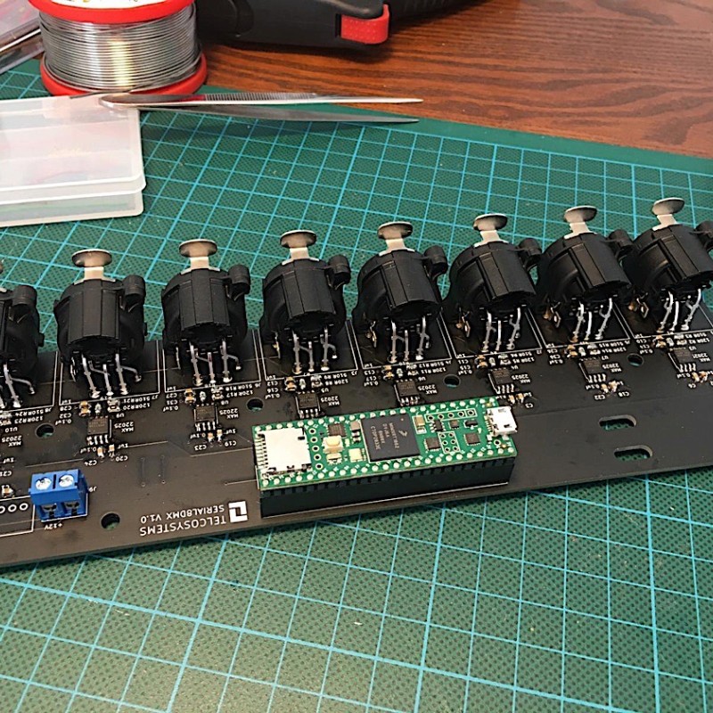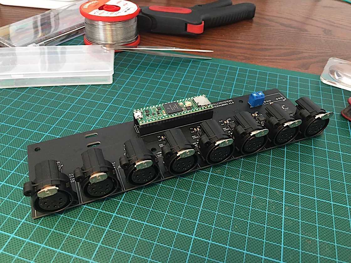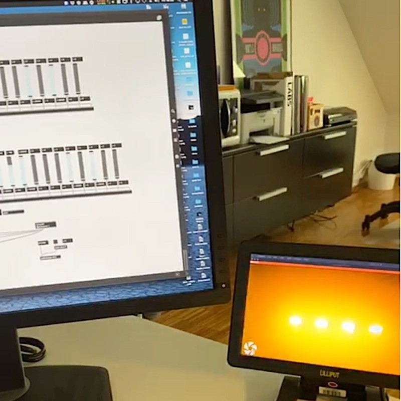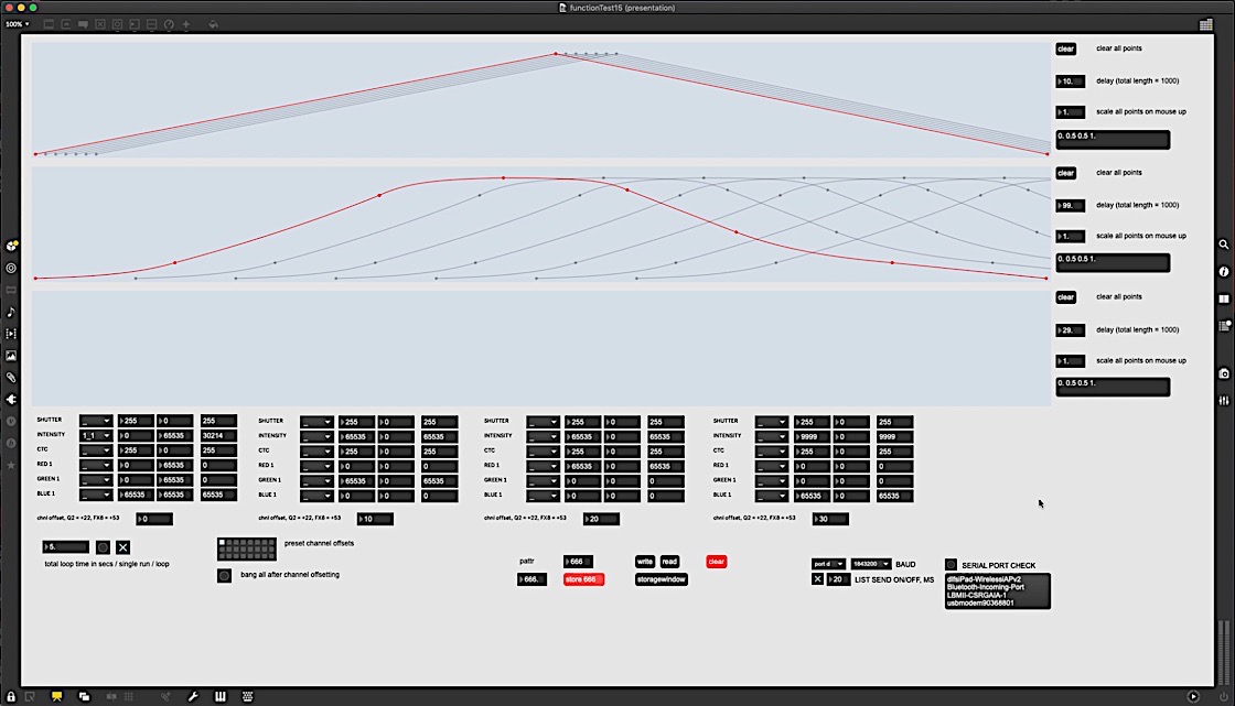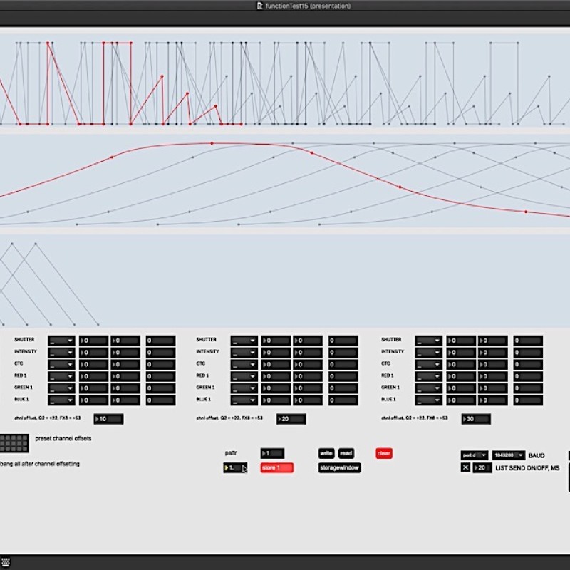 This research subsequently led to the development of a number of prototypes, and ultimately resulted in a custom DMX device that is suitable for controlling audio, video, light and machines (kinetika) at high speed. Together with a series of patches, we have thus developed a blueprint for a new composition engine.