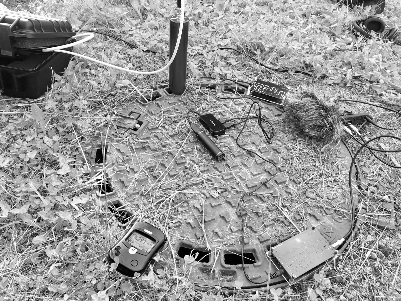 On the bottom of the Jazbec slope we found a water drainage with serious ammounts of radiation (up to 3.0 microsieverts). So we decided to make some field recordings here, combining two geigercounters, on gamma spectroscope, a stereomicrophone and a ambisonics microphone