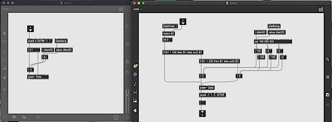 Based on the research and the experiments conducted, we have developed several prototypes. The first was based on the real-time peer-to-peer transfer of sync and data as a continuous signal. This turned out to be too prone to failure, synchronization proved difficult, and data feedback occurred. The second prototype was based on a server and three clients. However, this solution still requires a relatively large amount of bandwidth (4 channels in and 4 channels out for the clients, 12 channels in and 4 channels out for the server). And importantly, the bandwidth must be constant and stable, because we send and receive signals in real-time (almost real-time, with a latency of 0.3 seconds), buffering is not possible (something that is possible when streaming of pre-recorded audio or video, such as Netflix etc). Hiccups in the signal or accelerations and delays (which often happens with services such as Skype, Zoom, Teams) cannot occur, because that disrupts the sync with the local AV sources.