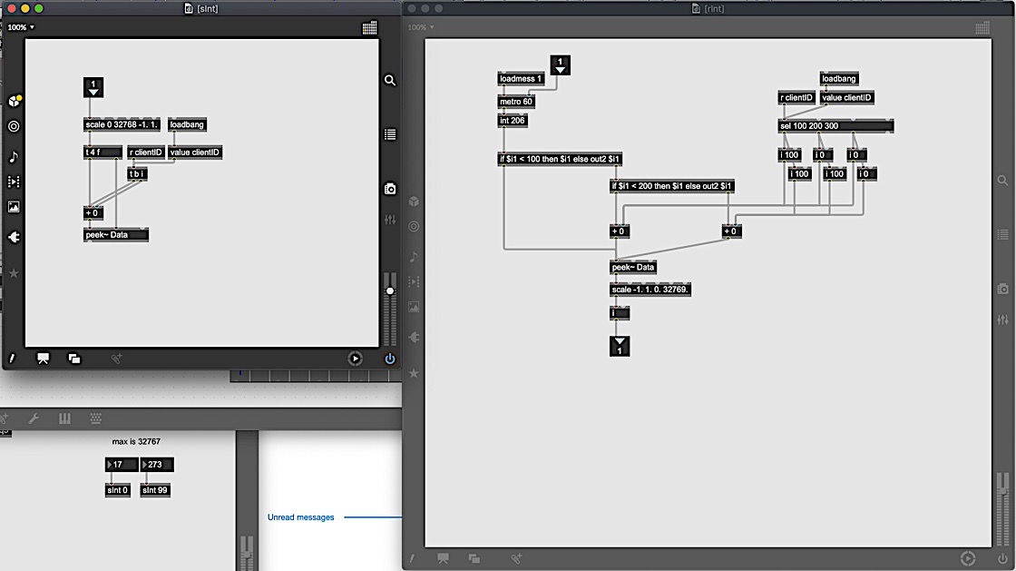 To be able to work in sync with each other, and to avoid data feedback, we experimented with two different network approaches: A non-hierarchical peer-to-peer setup and a hierarchical system with a server and multiple clients. The first approach seemed the most efficient in advance, but in practice it caused many problems because there was no central sync. Moreover, the number of required audio channels turned out to be much greater than with a hierarchical system with a server and several clients. So in the end we opted for a system with 1 server and 3 clients. The server sends a central sync signal to the clients, the clients send their audio and data to the server, and the server sends a mix of all audio signals and a data track to the clients. This way the clients can handle a 4 channel in-out audio stream, and the server has a 4 in, 12 out audio stream. By running the server from its own independent internet connection, this system works very stable. This solution also makes it very easy to prevent data feedback.